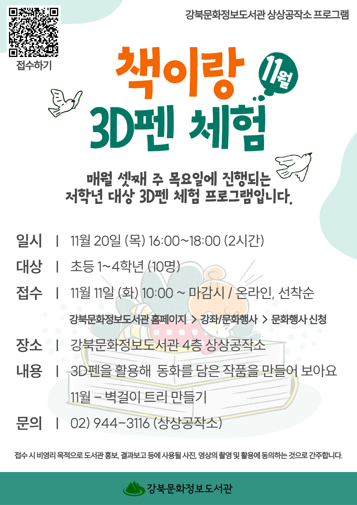 - [강북] 상상공작소 '책이랑 3D펜 체험-11월' 프로그램 안내 2025-11-07