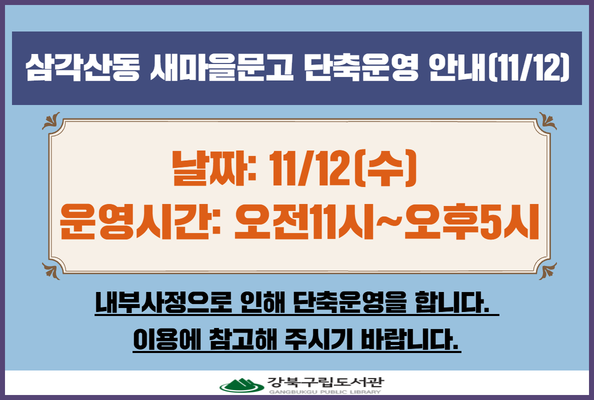 [작은도서관]삼각산동 새마을문고 단축운영 안내(11/12)