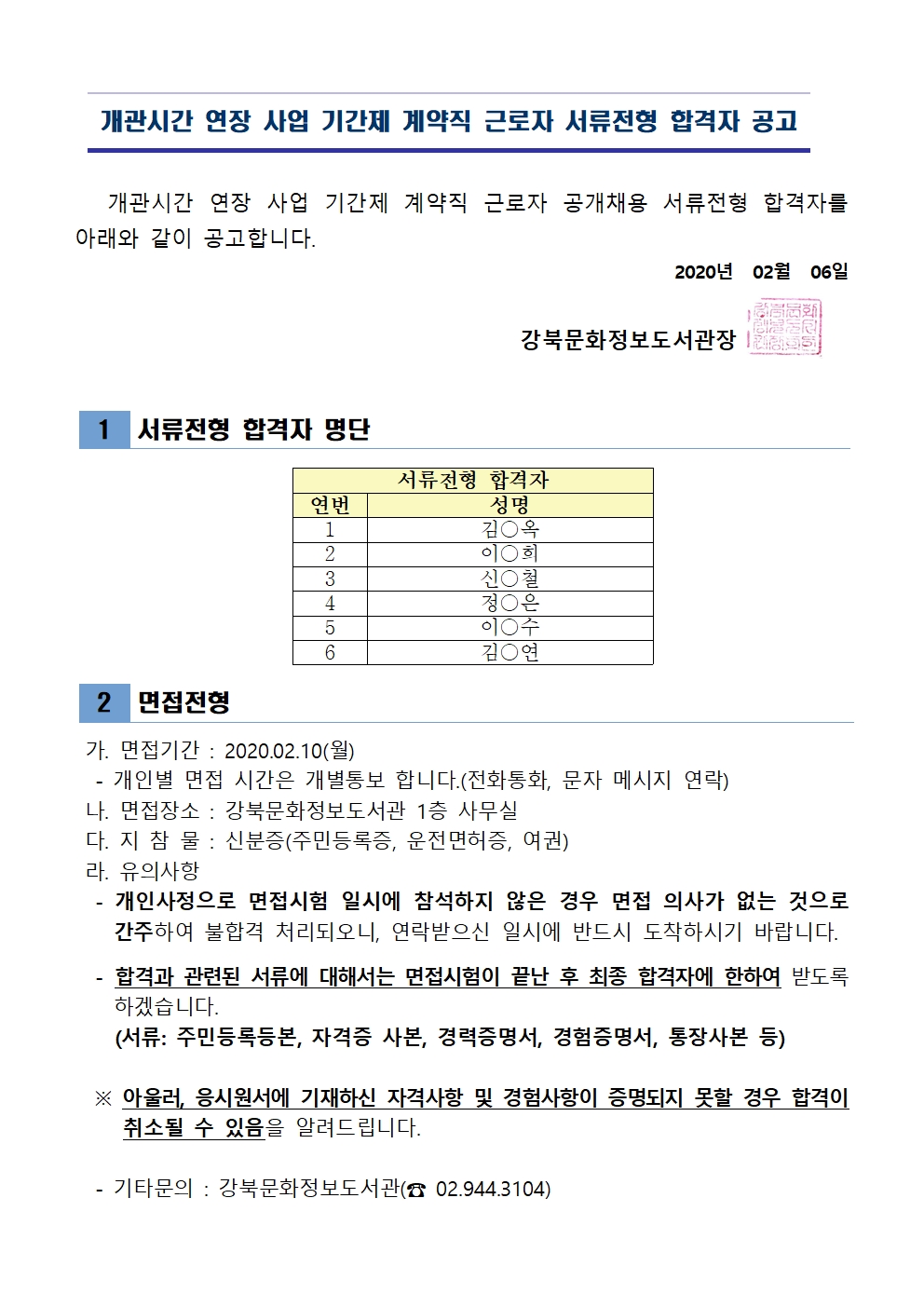 개관시간 연장 사업 단기간 근로자 서류전형 합격자 공고