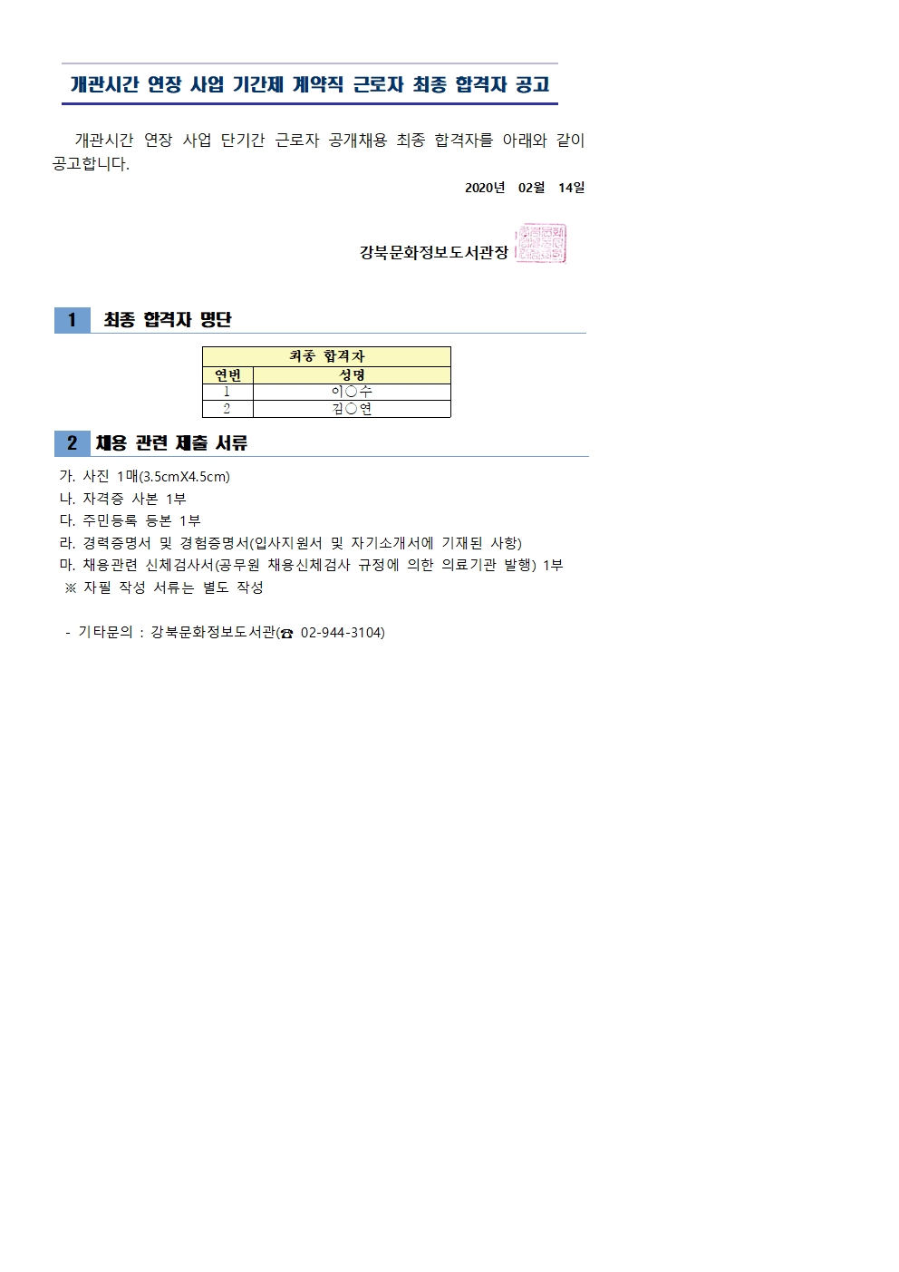 개관시간 연장 사업 기간제 계약직 근로자 최종 합격자 공고