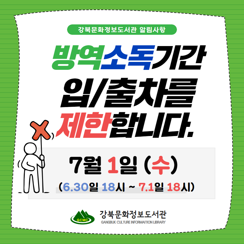 강북문화정보도서관 방역소독으로 인한 입/출차 제한 안내(7월 1일(수))
