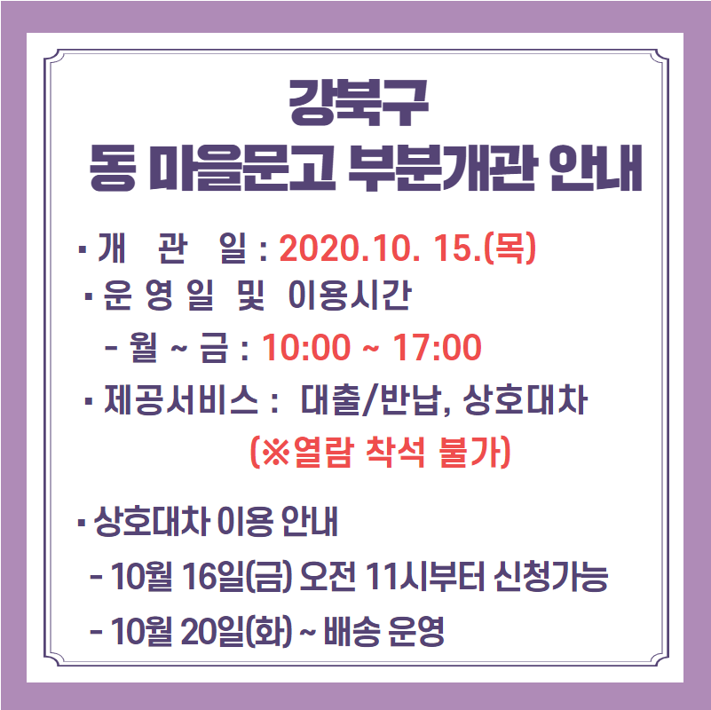 홍보) 강북구 동 마을문고 부분 개관 안내(10월 15일부터)