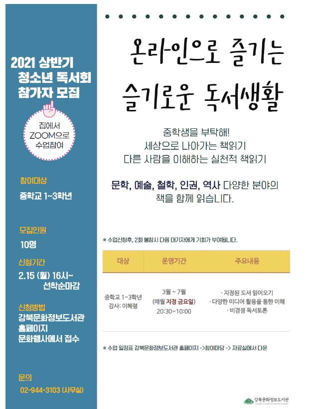 매월 1회 금요일에 진행되며, 도서관 홈페이지 자료실에 일정표가 등록되어 있으니, 참고하시고 신청해 주시기 바랍니다.