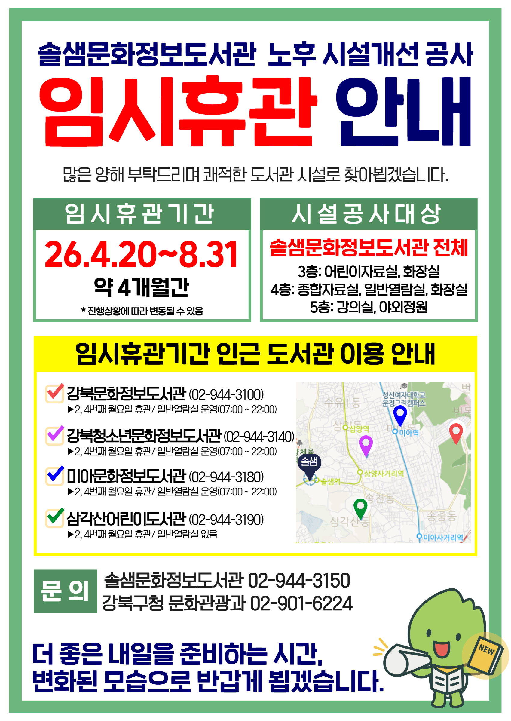 - [솔샘]솔샘문화정보도서관 노후 시설개선 공사 임시휴관 안내 2026-04-06
