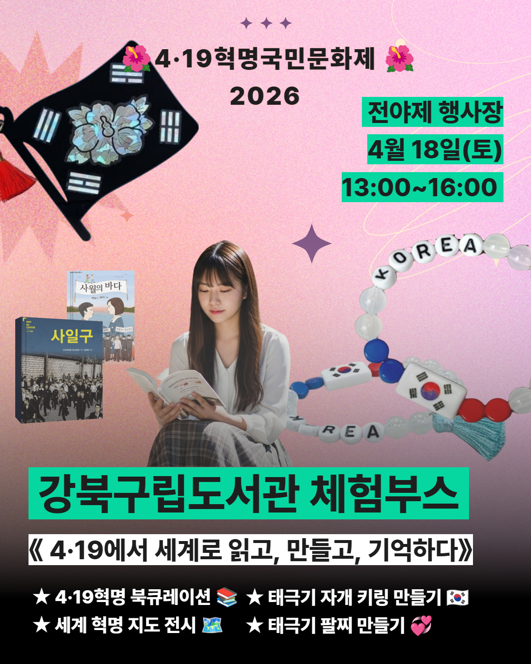 강북구립도서관 체험부스 「4·19에서 섹계로: 읽고, 만들고, 기억하다」4월 18일 토요일 《 4·19혁명국민문화제 2026 》 전야제 행사장에 도서관이 찾아갑니다!4·19혁명 유공자의 희생 정신을 기리고, 자유·민주·정의의 숭고한 정신을 되새길 수 있는 다양한 전시와 체험이 준비되어 있으니