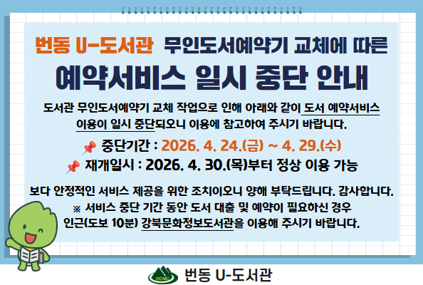 번동 U-도서관 무인도서예약기 교체에 따른 예약서비스 일시 중단 안내