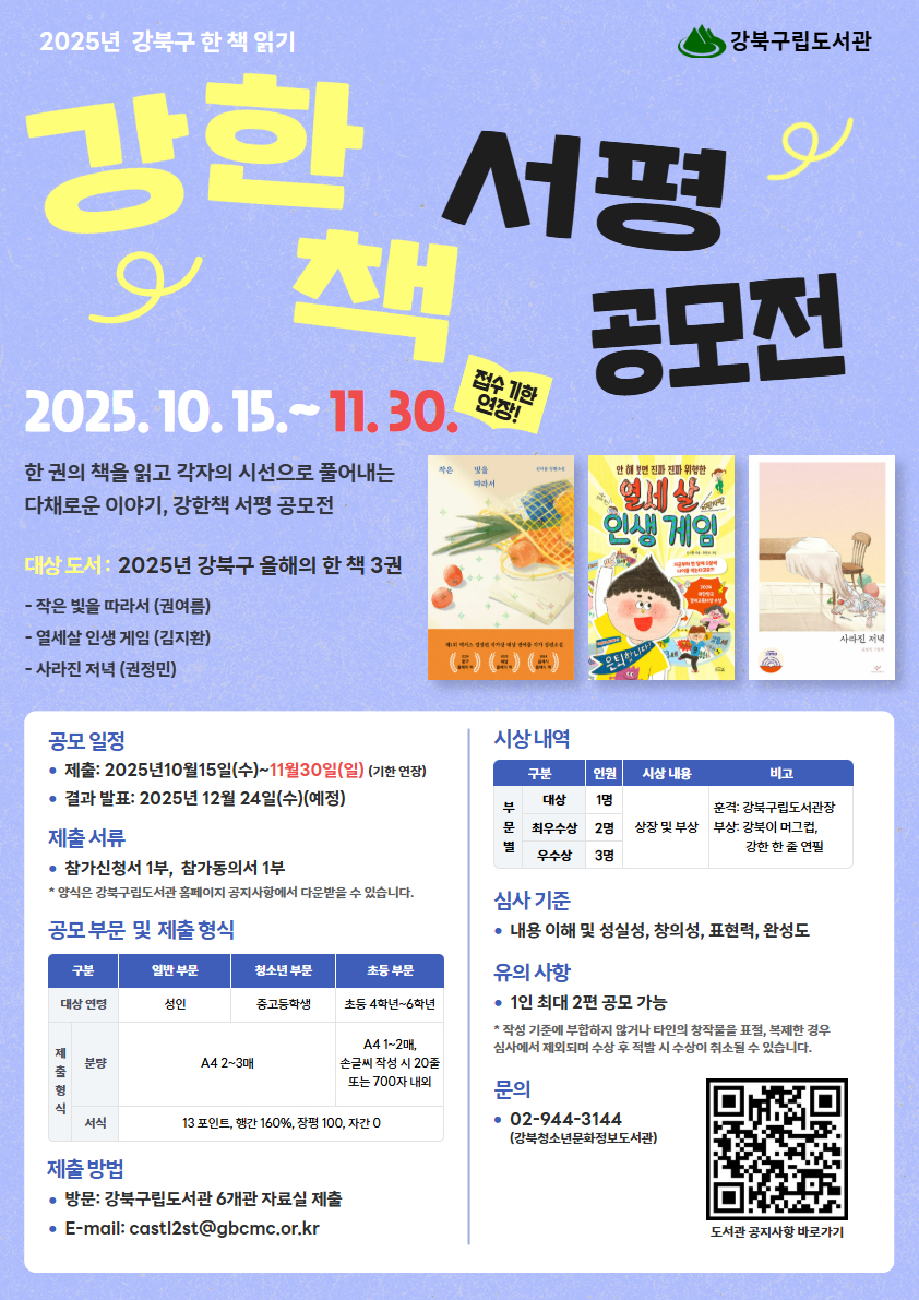 - [강북구 한 책 읽기] 2025년 강한책 서평 공모전(접수 기한 연장~11/30) 2025-10-10