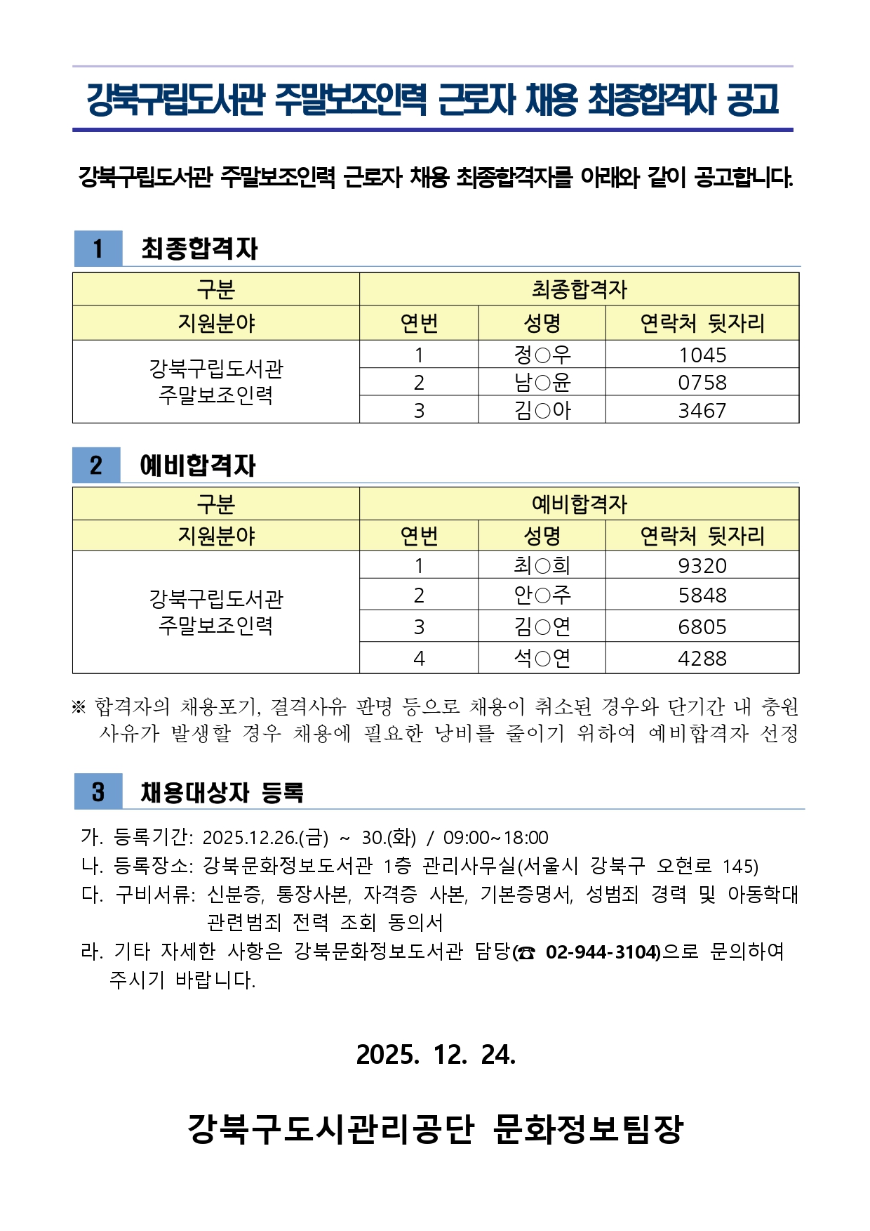 강북구립도서관 자료실 주말 보조인력 합격자 공고