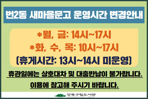 [작은도서관]번2동 새마을문고 운영시간 변경안내