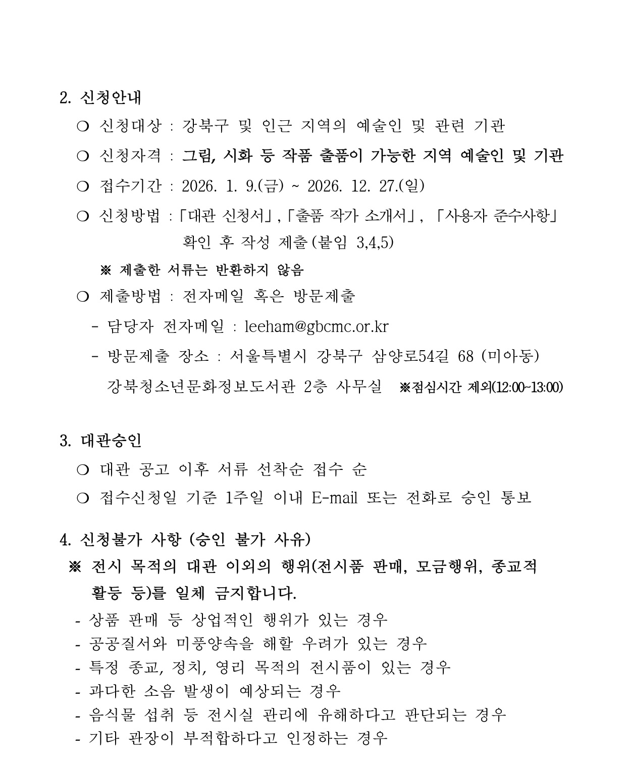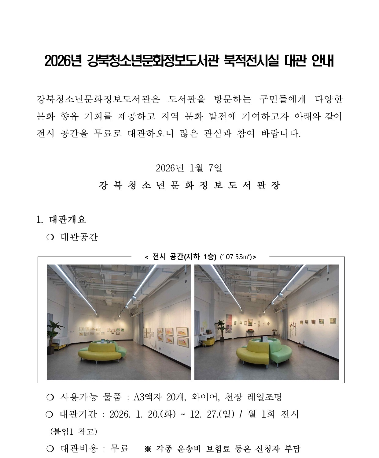 2026년 강북청소년문화정보도서관 북적전시실 대관 안내